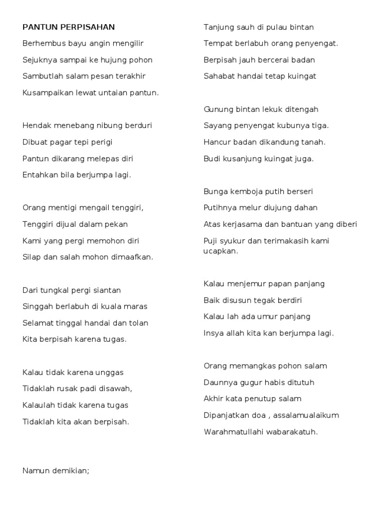 Pantun Cinta 80 Koleksi Pantun Melayu Sweet. Terutama saat harus terpisah dari orang yang kita sayangi apakah itu orang tua saudara kerabat sahabat kekasih teman sekolah maupun. Perpisahan sendiri bukanlah suatu hal yang tidak diinginkan oleh semua pihak pada dasarnya perpisahan adalah hal yang.